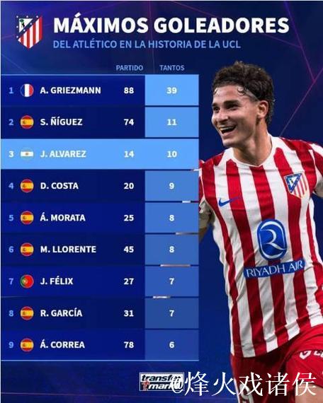 在刚刚更新的马德里竞技队史欧冠进球榜中,安托万·格列兹曼以39粒进球独占鳌头,正式将自己的名字牢牢刻在俱乐部欧战历史最显眼的位置。这一数据不仅体现了他作为队内头号球星的进攻效率,更折射出马竞在欧冠赛场